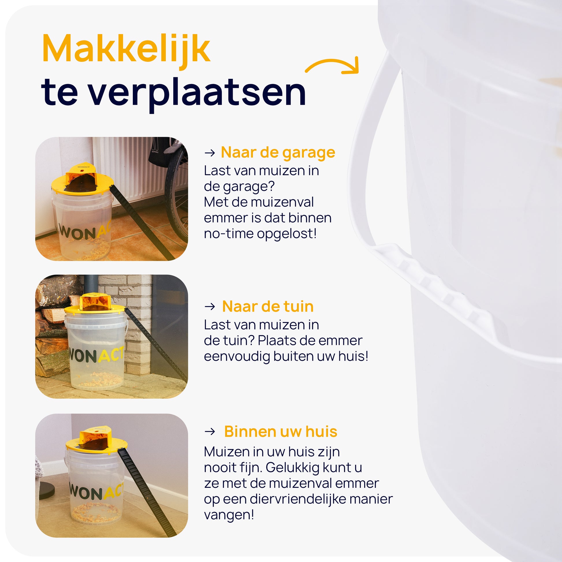 Last van muizen of een muizenplaag? Met deze complete emmer muizenval van Wonact vangt u meerdere muizen tegelijk – snel, veilig en diervriendelijk.